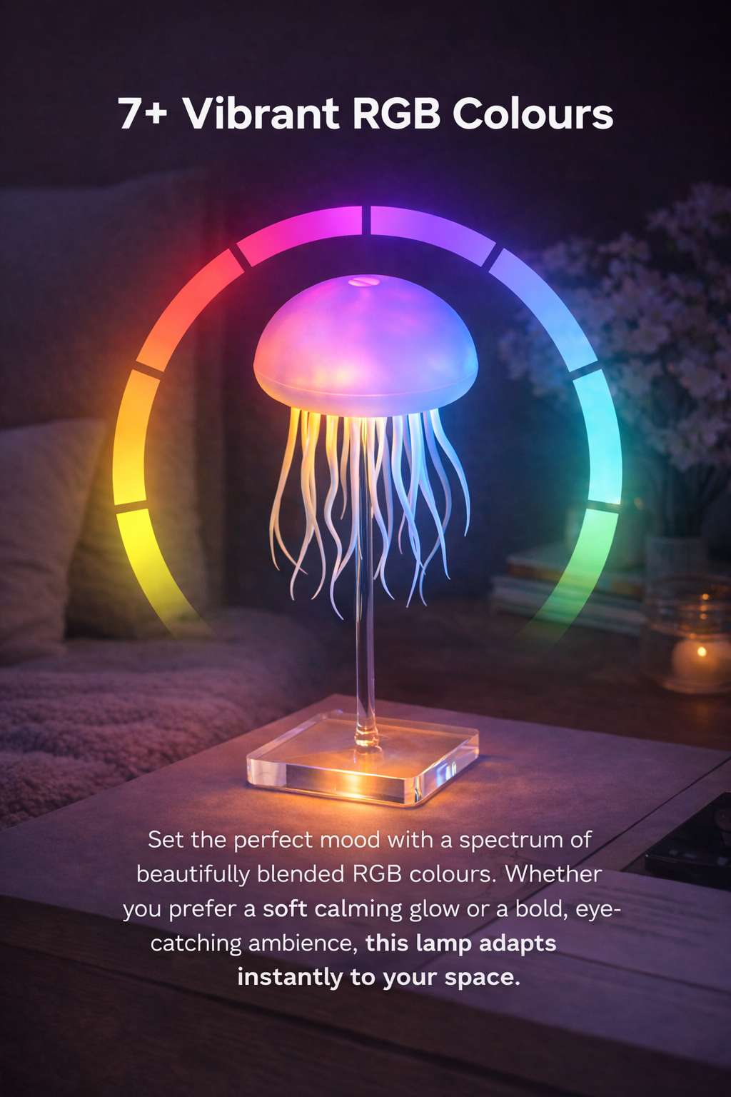 Set the perfect mood with a spectrum of beautifully blended RGB colours. Whether you prefer a soft, calming glow or a bold, eye-catching ambience, this lamp adapts instantly to your space.
